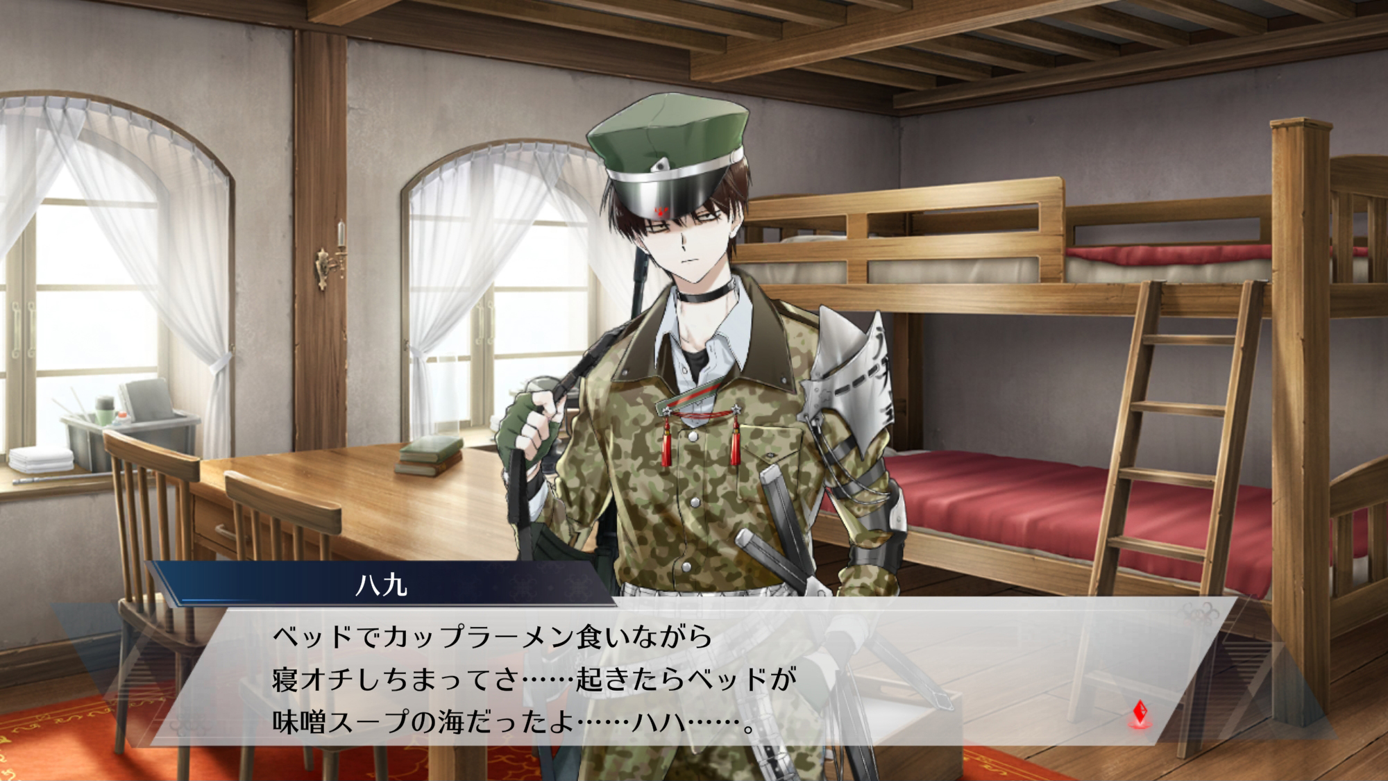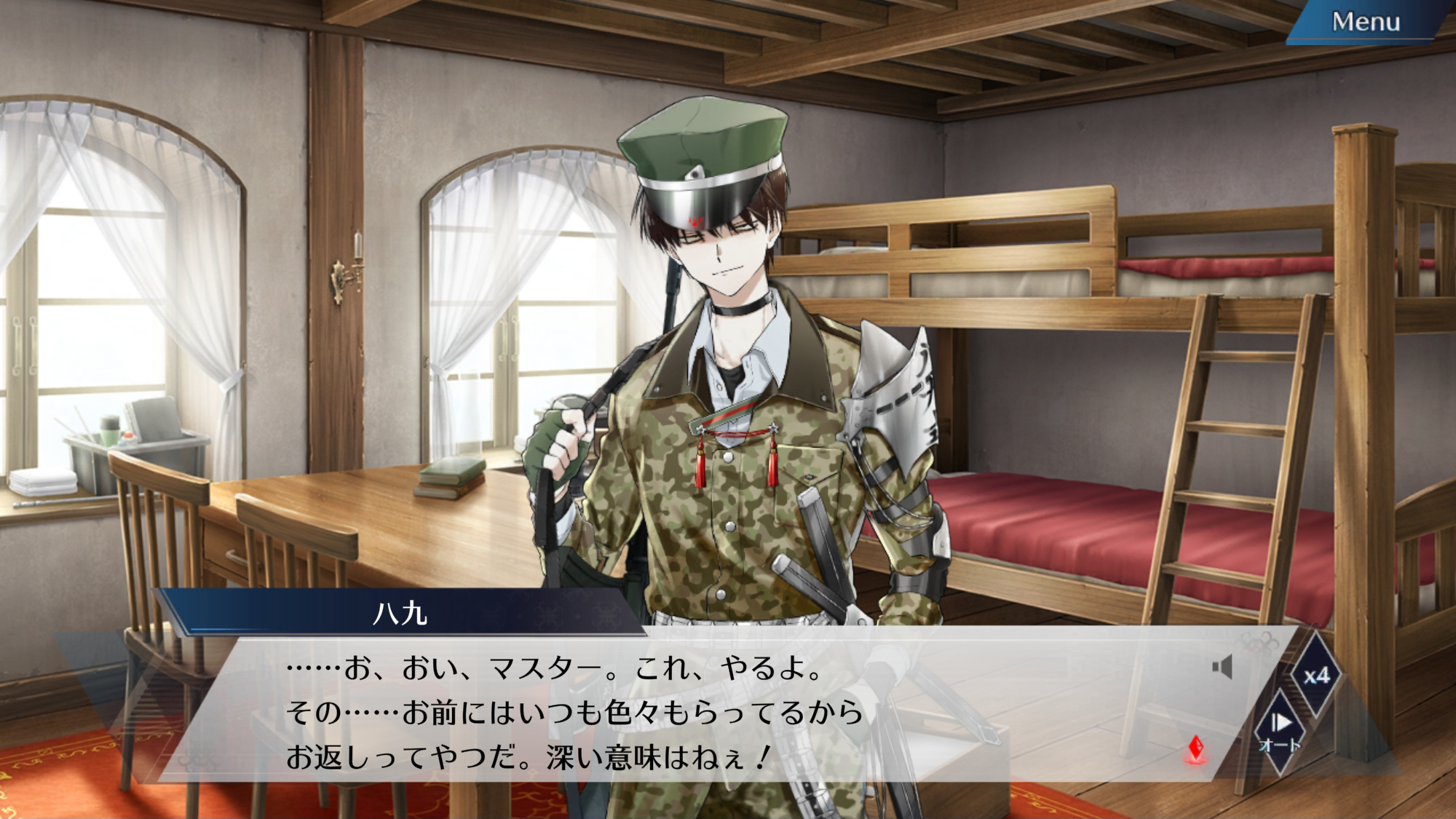 | 너, 총 손질을 잘한다며. 어쩐지 여기저기서 들리더라. ……솔직히 손질하기 귀찮달까……귀찮지 않아? 안 귀찮아? 진짜로? 그럼, 부탁해도 될까? 이야─, 고마워─. 잘 부탁해. |