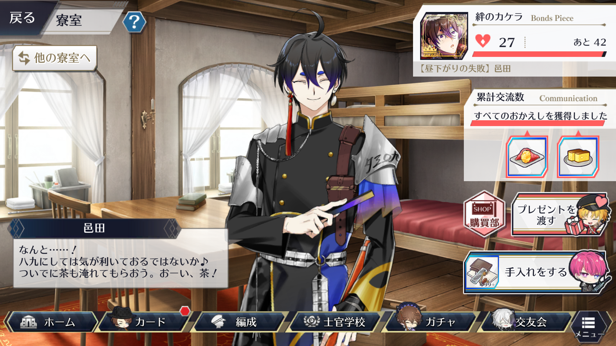 [베니호노카] 하치큐가 무라타에게 보내는 선물,이 아니라 공물. 기숙사실에서 무라타에게 줄 수 있다. 무라타는 아리사카를 위해 ‘베니아즈사’를 사느라 바쁘므로, ‘베니호노카’를 사는 것은 하치큐의 역할. 조금 동정해버리고 만다. |